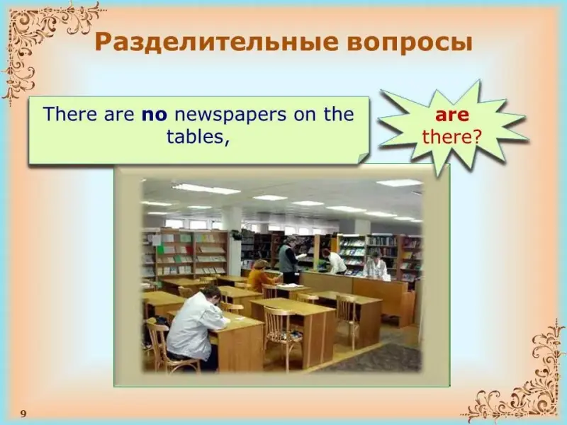 Задание №1: Определите тип вопроса к данным изображениям: 0 - 1. There is no telephone on the table, is there? 2. Is there a theatre in the city? 3. How many puppies are there in the garden? 4. Is there a bear or a tiger in the cage? 5. Is there any tea or coffee in the cup? 6. There is a lot of milk in the jug, isn't there? 7. Are there nice flowers in the garden? 8. Who is there in the library? Задание №2: переведите вопросы на русский язык. Задание №3: Дайте краткие или полные ответы. |