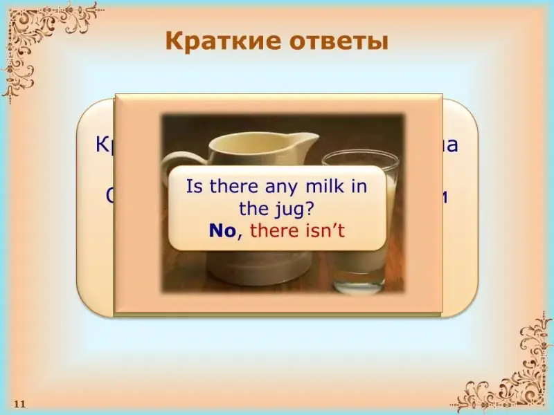 0 - 1. Краткие ответы обычно дают на общие вопросы. Они состоят из слова Yes/No и оборота there is/are в утвердительной или отрицательной форме в соответствующем времени. 2. Пример с исчисляемым существительным: Is there a library at your institute? - В вашем институте есть библиотека? Yes, there is. - Да, есть. 3. Пример с неисчисляемым существительным: Is there any milk in the jug? - В кувшине есть молоко? - No, there isn't. - Нет. |