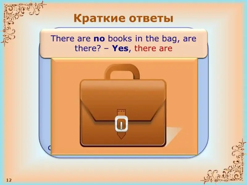 Однако следует помнить: в ответах на вопросы с предшествуюшим отрицательным предложением существует расхождение в употреблении no/yes в английском языке и нет/да в русском. В английском no означает согласие с собеседником, а yes - несогласие. There is an apple on the plate, isn't there? - Yes, there is. - На тарелке - яблоко, не так ли? - Да. (Согласие с утверждением) There is some milk in the cup, isn't there? - No, there isn't. - В чашке молоко, не так ли? - Нет, не так.(Несогласие с утверждением) There is no TV set in the bedroom, is there? - No, there isn't. - В спальне нет телевизора, не так ли? - Да, нет телевизора. ( Согласие с собеседником). 4. There are no books in the bag, are there? - Yes, there are. - В портфеле нет книг, не так ли? - Нет, не так, есть книги. (Несогласие) |