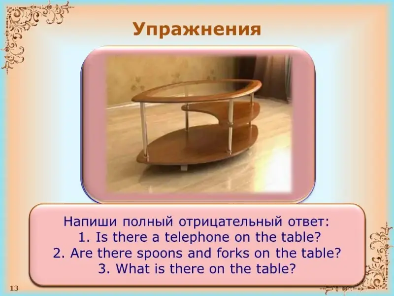 Упражнения. Укажи правильный вариант перевода: There is no telephone in the room. Телефона нет в комнате. В комнате нет телефона. 1. Переведи на английский язык: В библиотеке - студенты. (There are some students in the library). Сколько студентов в библиотеке? (How many students are there in the library?) На столе есть лампа? (Is there a lamp on the table?) 2. Составьте предложения с оборотом there is/are: How many, are, children, there, at, the table? (How many children are there at the table?) TV set, is, in, there,no, the room. (There is no TV set in the room.) A girl, there, at the table, is. (There is a girl at the table.) 3. Напиши полный отрицательный ответ на следующие вопросы: Is there a telephone on the table? (There is no telephone on the table) Are there spoons and forks on the table? (There are neither spoons nor forks on the table) What is there on the table? (There is nothing on it. - На нём ничего нет). |