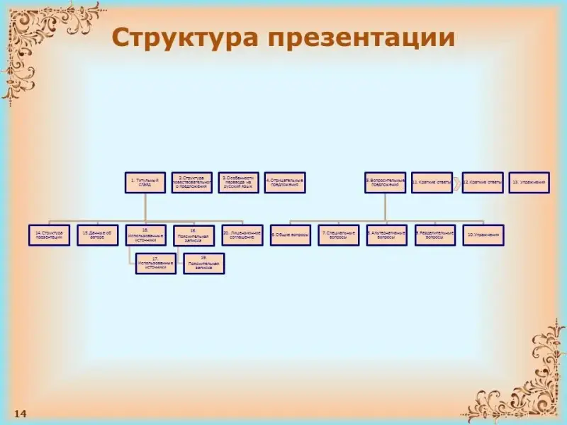 Объясняет особенности употребления оборота и структуру повествовательного предложения.