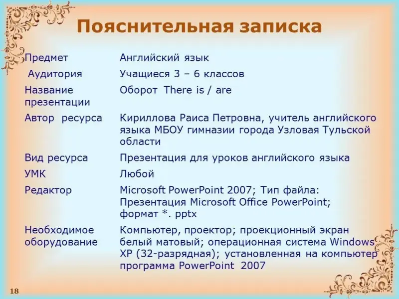 Техническое обеспечение ресурса. Презентация выполнена в программе MS PowerPoint 2007. Для использования данного ресурса потребуется компьютер, экран, мультимедийный проектор.