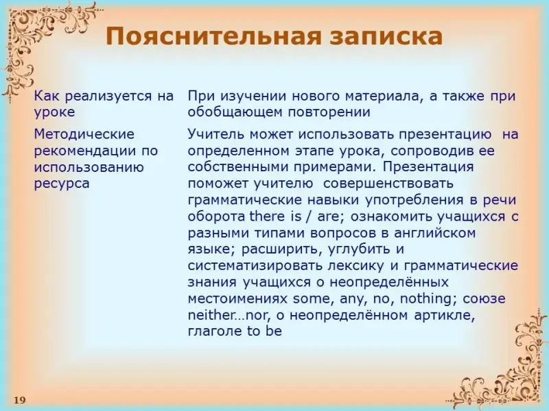 Презентация поможет учителю совершенствовать грамматические навыки употребления в речи оборота there is / are; ознакомить учащихся с разными типами вопросов в английском языке; расширить, углубить и систематизировать лексику и грамматические знания учащихся о неопределённых местоимениях some, any, no, nothing; союзе neither...nor, о неопределённом артикле, глаголе to be.