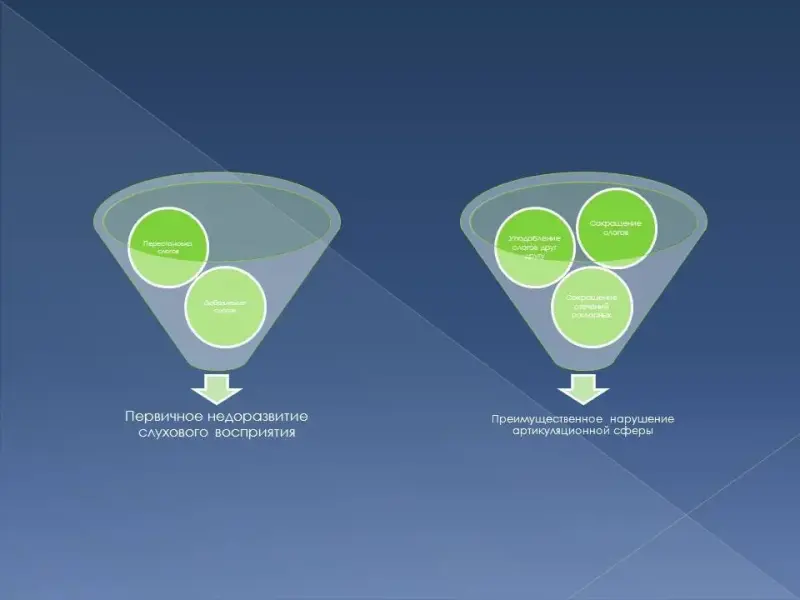 Преобладание ошибок, выражающихся в перестановке или добавлении слогов, свидетельствует о первичном недоразвитии слухового восприятия ребенка. Ошибки типа сокращения числа слогов, уподобление слогов друг другу, сокращение стечений согласных указывают на преимущественное нарушение артикуляционной сферы. (6 слайд)