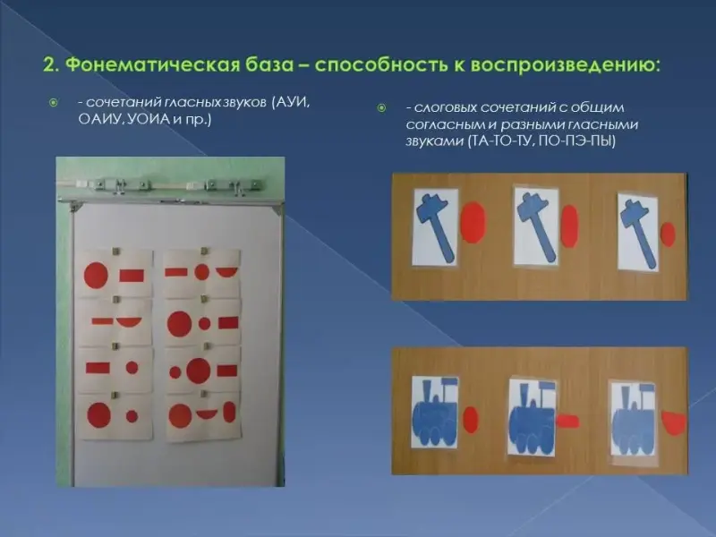 Фонематическая база - способность к воспроизведению: сочетаний гласных звуков (АУИ, ОАИУ, УОИА и пр.), слоговых сочетаний с общим согласным и разными гласными звуками (ТА-ТО-ТУ, ПО-ПЭ-ПЫ) (14 слайд); слоговых сочетаний с общим гласным и разными согласными звуками (ПА-КА-ТА, ДО-ГО-БО); слоговых сочетаний с согласными звуками, оппозиционными по звонкости-глухости (ДА-ТА, ВА-ФА) (15 слайд); слоговых сочетаний с согласными звуками, оппозиционными по твёрдости-мягкости (ТА-ТЯ, ПА-ПЯ); слов, близких по звуковому составу (ТАК-ТОК-ТУК)(16 слайд).
