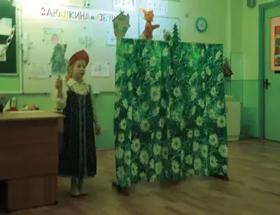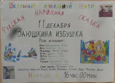 У входа в класс, где проходил спектакль, была вывешена афиша, нарисованная детьми. Всем приглашённым были розданы билеты, изготовленные учениками. На классной доске разместили рисунки детей - иллюстрации к данной сказке. Родители сделали ширму и сшили костюмы.