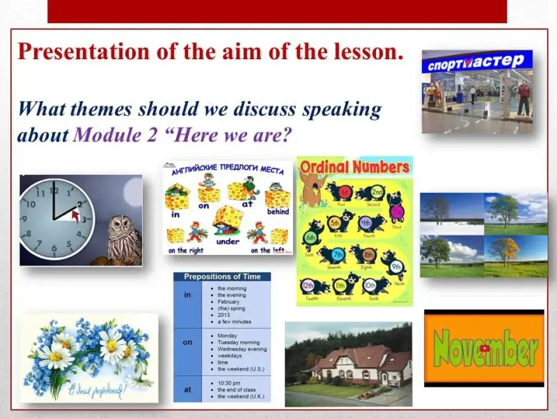 1.Укрепление умения использовать пройденную лексику по теме "Я и мир вокруг меня", а также грамматический материал: порядковые числительные, местоимения some, any, предлоги места и