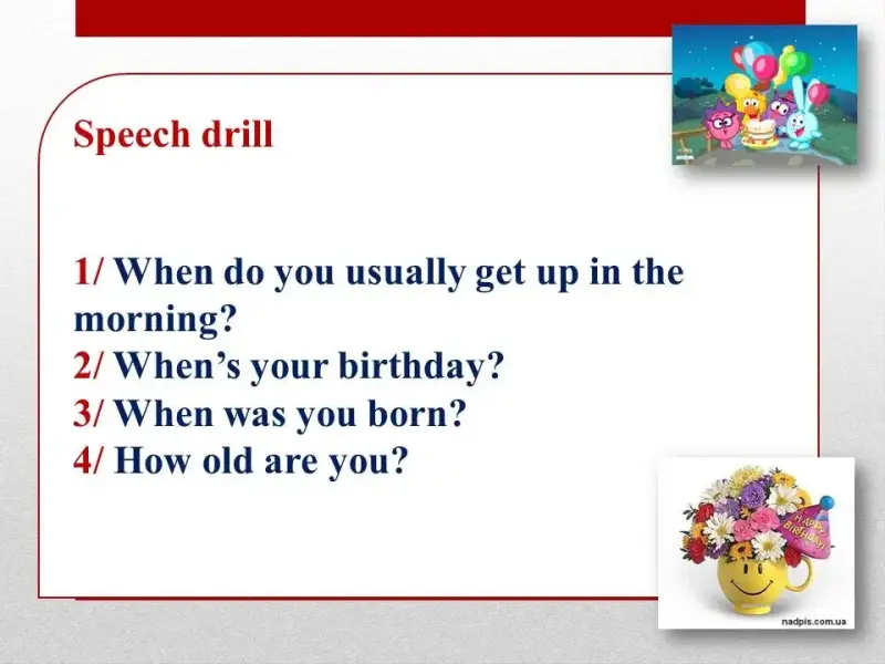 1/ When do you usually get up in the morning? 2/ When's your birthday? 3/ When was you born? 4/ How old are you? Well done. |