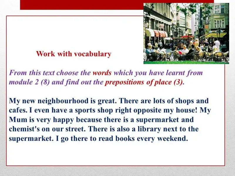 From this text choose the words which you have learnt from module 2 (8) and find out the prepositions of place (3) | Work in groups |