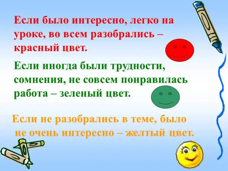 Учитель: У вас на столе лежат листочки зелёного, жёлтого, красного цвета, выберите тот листочек, который вы считаете, соответствует вашим знаниям на данном уроке (слайд 31)