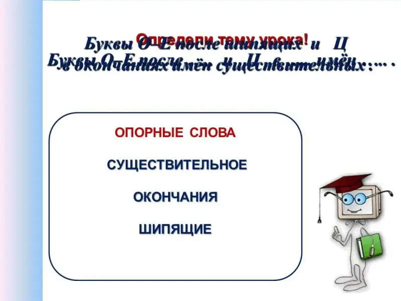 Познакомить учащихся с условиями выбора букв о и е после шипящих и ц в окончаниях имён существительных.