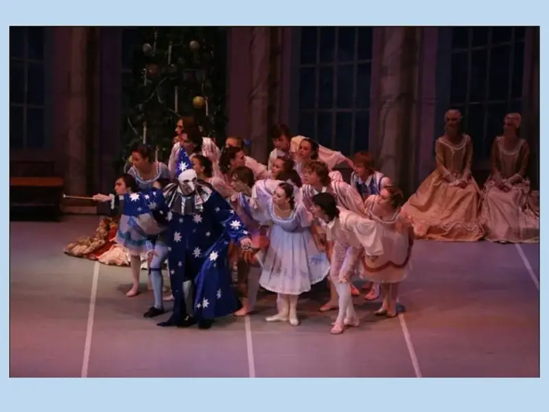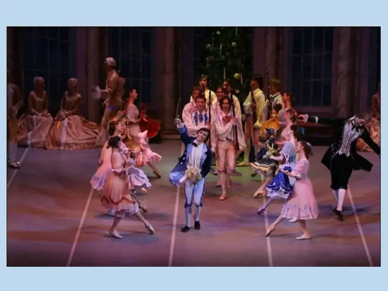 Открывается занавес. В доме девочки Маши готовятся к Рождественскому празднику. Наконец раздаются звуки марша, дети радостно идут в комнату, где стоит праздничная, украшенная огнями и игрушками елка. (Слушание "Марша" из первого действия.)