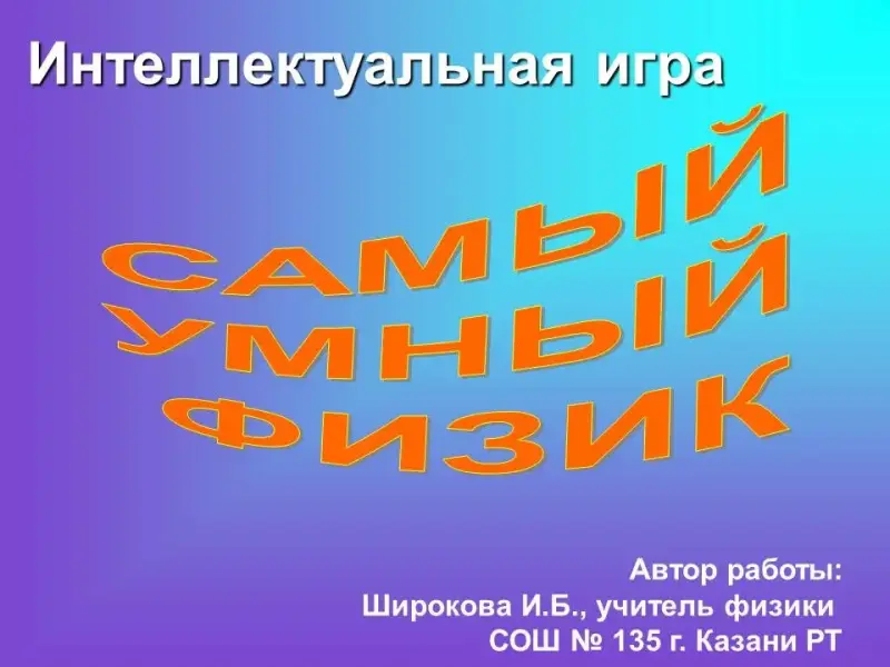 В методической разработке представлена интеллектуальная игра "Самый умный физик", которая проводится ежегодно среди учащихся 10-х классов общеобразовательных школ. Каждый год игра приурочена к какой-нибудь знаменательной дате в области физики и технике, чем и объясняется тематика вопросов игры.