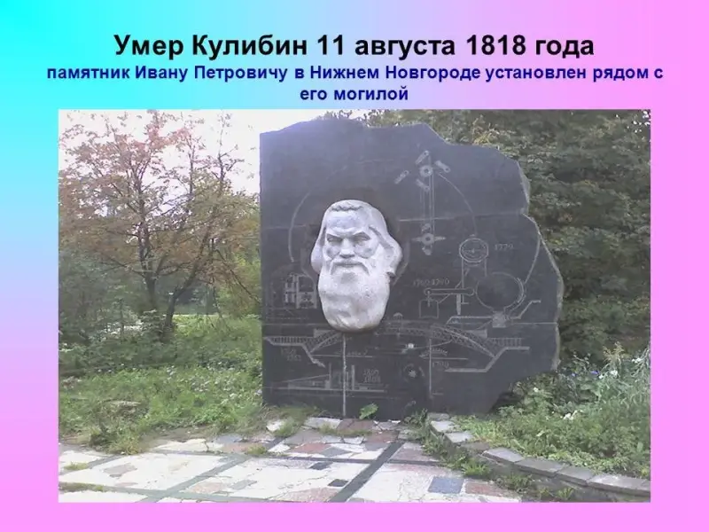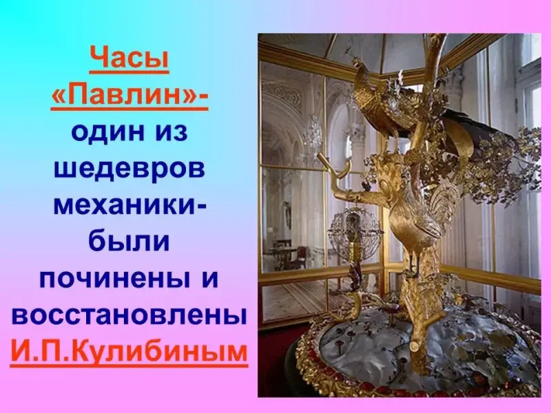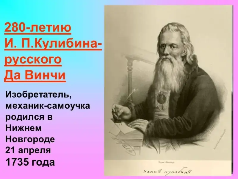 Сегодняшняя игра посвящена 280-летию Кулибина, которое будет отмечаться 21 апреля 2015 года (слайд №№ 2-9)