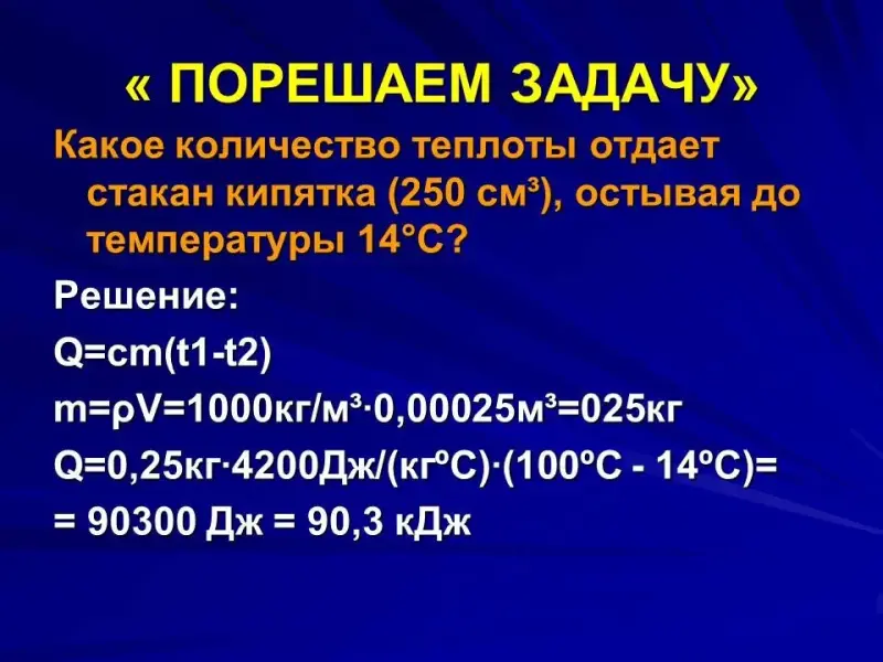 Какое количество теплоты отдает стакан кипятка (250 см3), остывая до температуры 14°C?