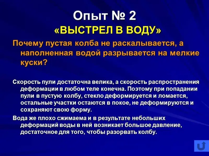 Вода же плохо сжимаема и в результате небольших деформаций воды в ней возникает большое давление, достаточное для того, чтобы разорвать колбу.