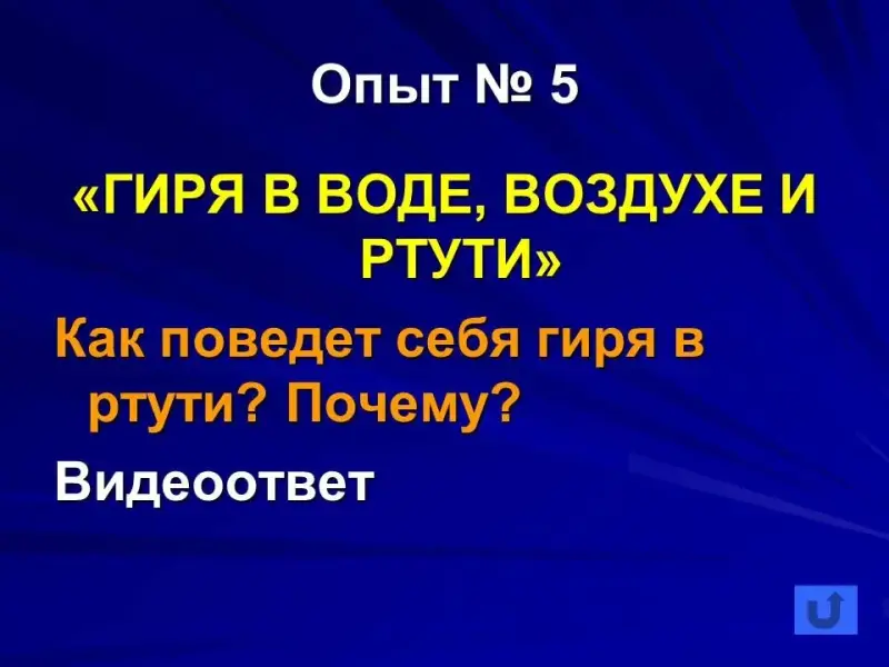 5 опыт "Гиря в воде, воздухе, ртути" (слайд № 36)