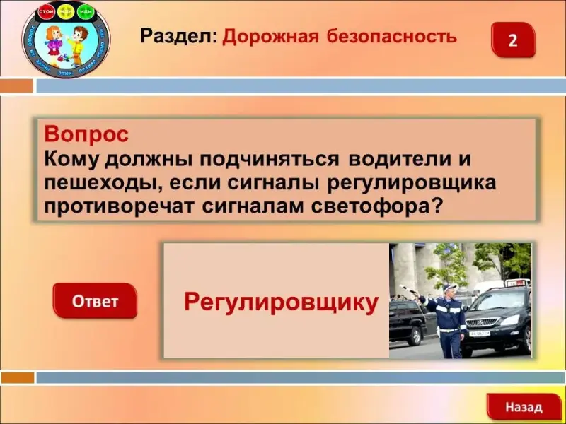 Участнику предлагается 2 задачи на знание сигналов регулировщика.