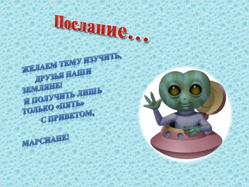 Ученик: Внимание! Внимание! Только что на территорию школы опустилась "летающая тарелка". Из неё выпала вот эта капсула. Братья по разуму передали нам свое послание. Давайте его прочитаем. (Читает)