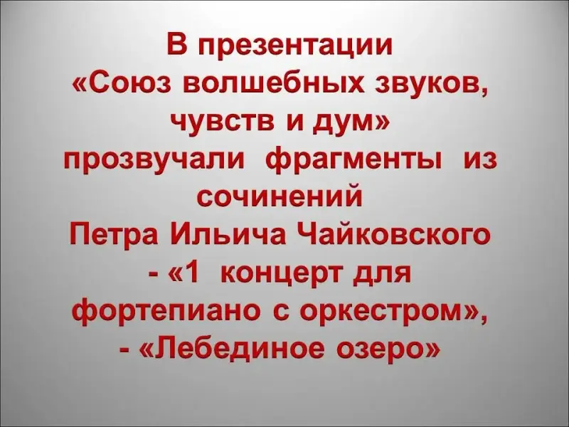 Слово учителя: Музыка и литература переплетены так крепко, что представить одно без другого просто невозможно. Произносим имя Александра Пушкина и рядом всегда музыка Петра Ильича Чайковского. Когда читаем стихи, то обязательно используем термины, которые нам знакомы по урокам музыки: созвучие, гармония, интонация ...