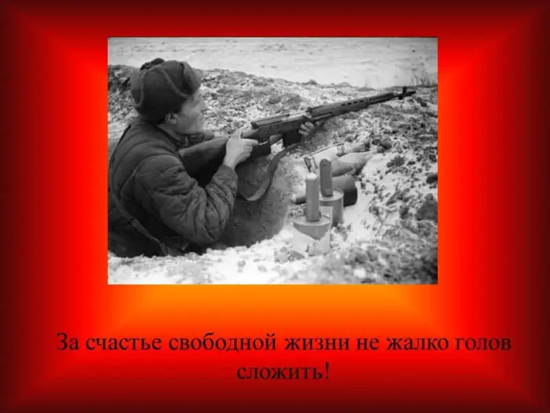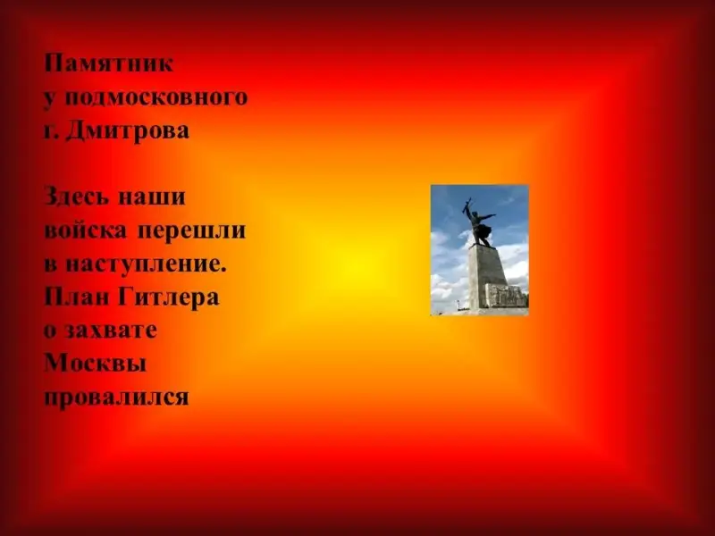 Неизвестный солдат. Он упал на заснеженную декабрьскую землю на 41 километре под Москвой. Неизвестный солдат... Мы ничего не знаем о нем. Знаем только, что на шапке - ушанке его алела звезда, что землю, на которую он упал, он любил больше всего в жизни, что в час его гибели, совершился исторический перелом: наши войска отбросили врага от Москвы, и начали свой победоносный путь до Берлина.