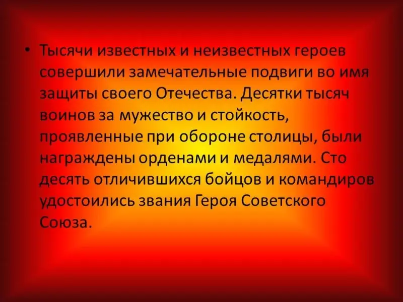 Тысячи известных и неизвестных героев совершили замечательные подвиги во имя защиты своего Отечества. Десятки тысяч воинов за мужество и стойкость, проявленные при обороне столицы, были награждены орденами и медалями. Сто десять отличившихся бойцов и командиров удостоились звания Героя Советского Союза.