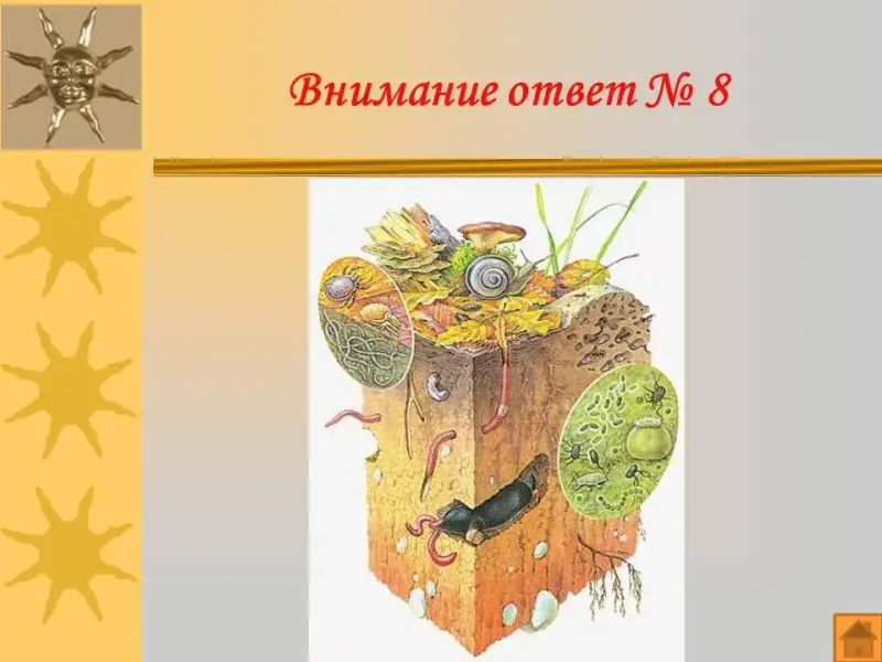 Послушайте сказку: Расположен в поле Теремок, он не низок, не высок. На полезной площади в один квадратный метр уживаются в нём: важные господа - Нематода, Ногохвостка да Клещ, а поближе к бассейну во дворе проживает почтенная Амёба и её друзья - Коловратка, Жгутиконосец, Моллюски да Ракообразные. У открытых окошек любят отдыхать неспешный Жук да тихоня Паук. А порядок там наводит Червь кольчатый с помощниками. А всего жильцов на квадратном-то метре - ни много, ни мало - двадцать миллиардов!
