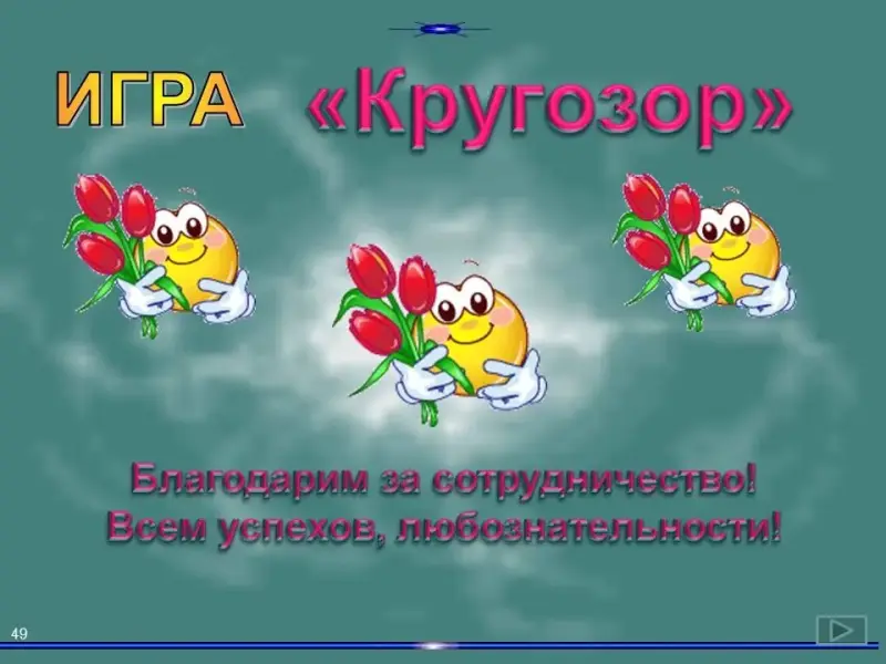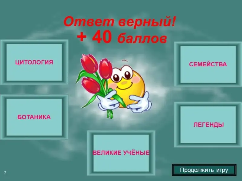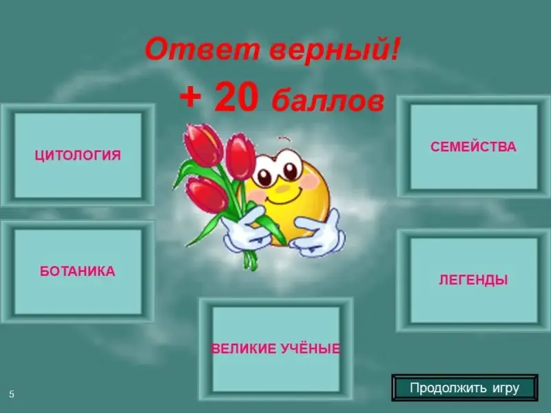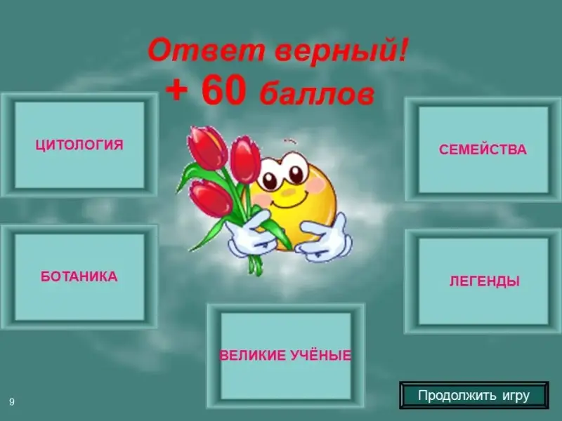 • Чтобы вернуться на главный слайд, необходимо кликнуть на текст "Продолжить игру".