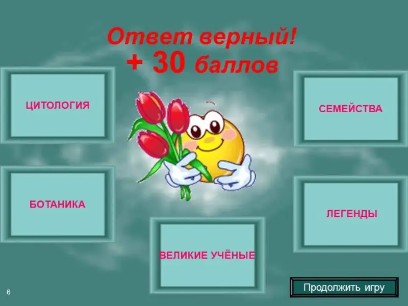 За каждый правильный ответ команда получает баллы и право выбрать следующий вопрос. Команда делает второй выбор, и даже если отвечает правильно, ход переходит следующей команде. Это необходимо для того, чтобы как можно большее количество учащихся приняло участие в игре