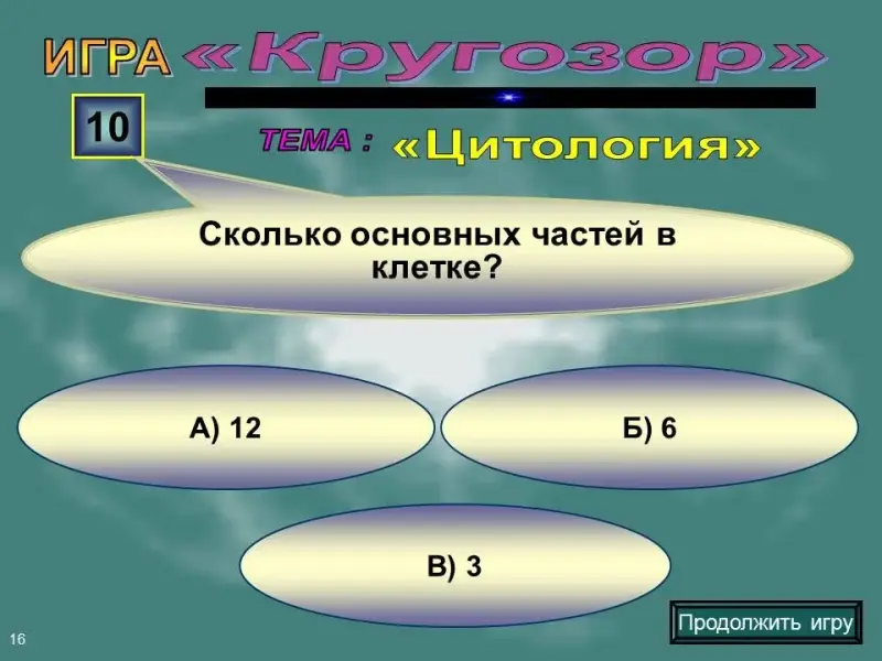 Слайд 16. Вопрос на 10 баллов. Сколько основных частей в клетке: