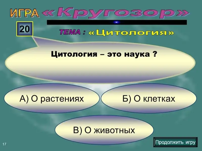 Слайд 17. Вопрос на 20 баллов. Цитология - это наука: