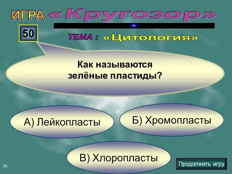 Слайд 20. Вопрос на 50 баллов. Как называются зелёные пластиды: