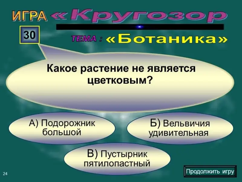 Слайд 24. Вопрос на 30 баллов. Какое растение не является цветковым: