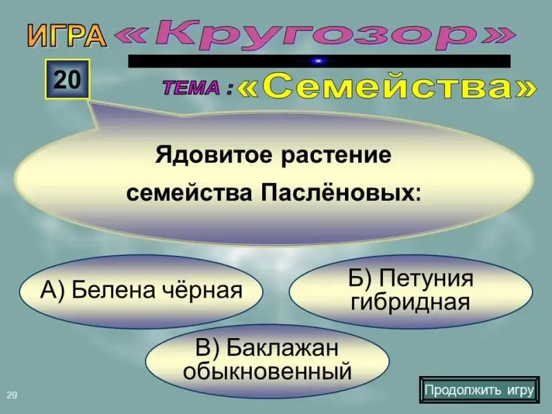 Слайд 29. Вопрос на 20 баллов. Ядовитое растение семейства Паслёновые: