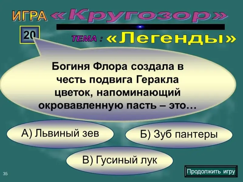 Слайд 35. Вопрос на 20 баллов. Богиня Флора создала в честь подвига Геракла цветок, напоминающий окровавленную пасть - это: