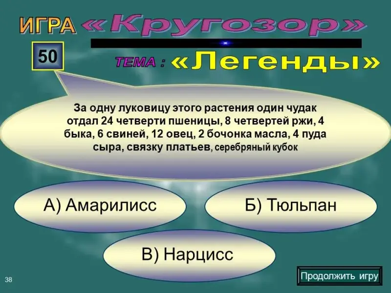 Слайд 38. Вопрос на 50 баллов. За одну луковицу этого растения один чудак отдал 24 четверти пшеницы, 8 четвертей ржи, 4 быка, 6 свиней, 12 овец, 2 бочонка масла, 4 пуда сыра, связку платьев, серебряный кубок: