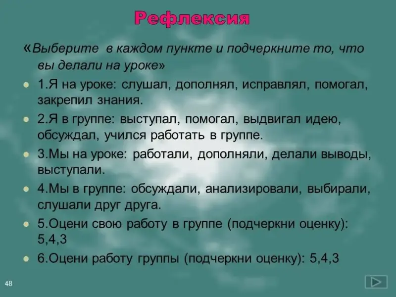 Слайд 48. Рефлексия: Оценивается работа каждого учащегося внутри команды.