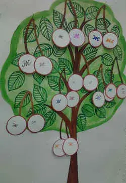 Ученики по очереди пишут фломастером строчную букву "ж" на вишенках и "одевают" дерево. < Рисунок 1>