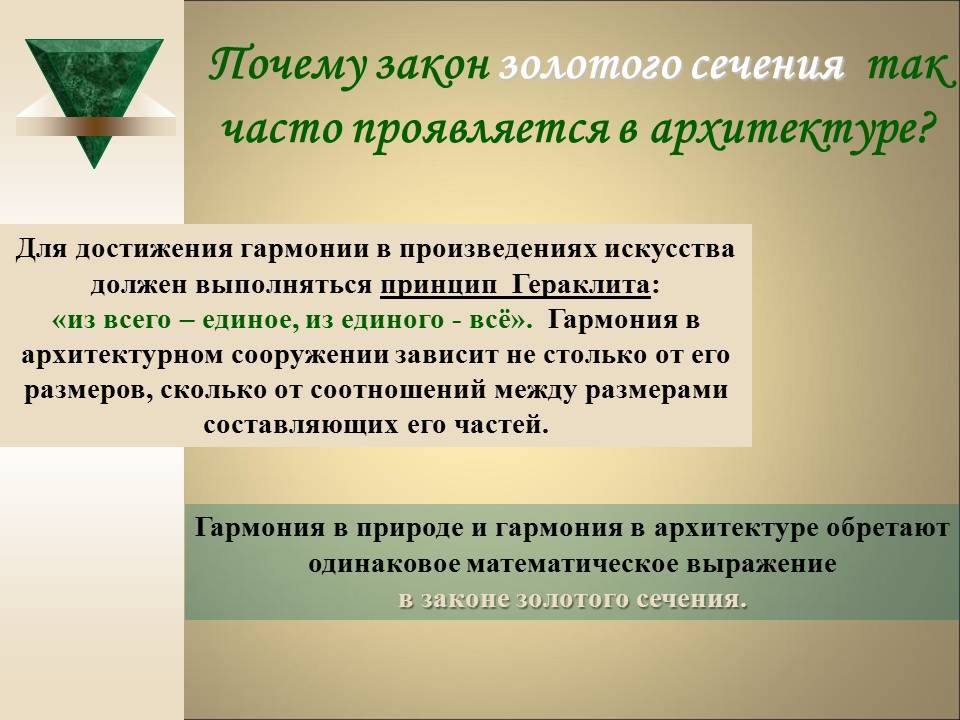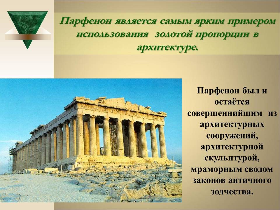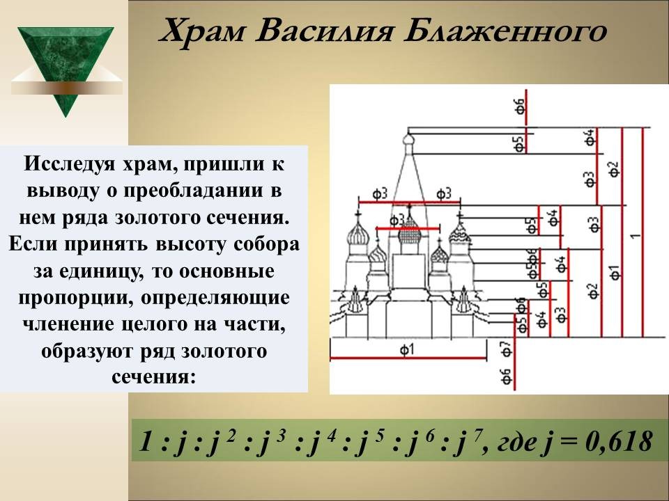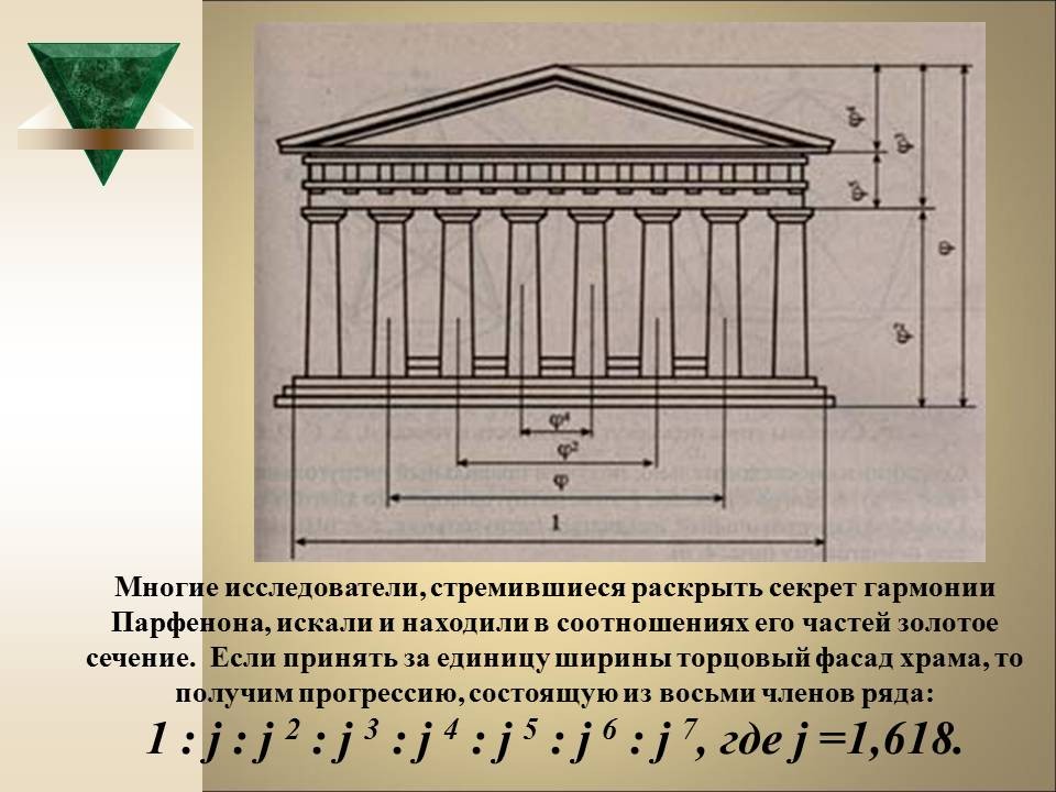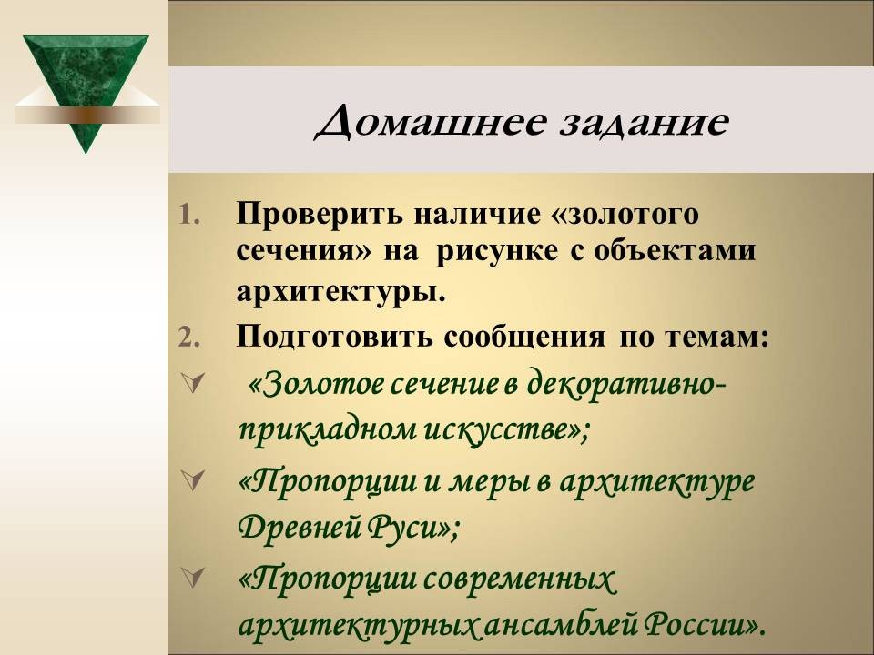 | 8. | Геометрия архитектурной гармонии | 2 | Понятие “золотого сечения”. Ряд Фибоначчи. “Золотое сечение” в окружающем мире, архитектуре и искусстве. | Исследование числовых закономерностей ряда Фибоначчи. Исследование объектов окружающего мира, произведений искусства и архитектуры на наличие “золотого сечения”. |