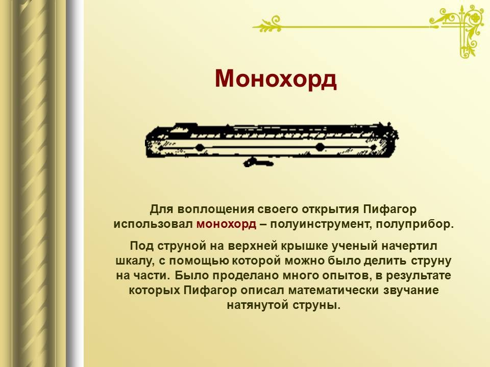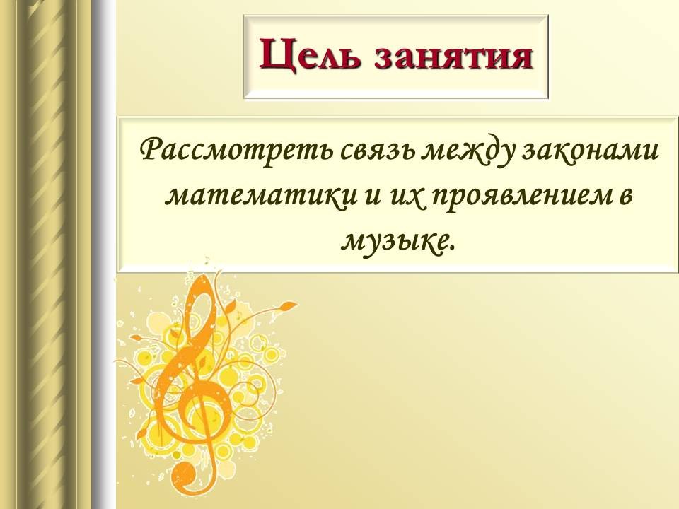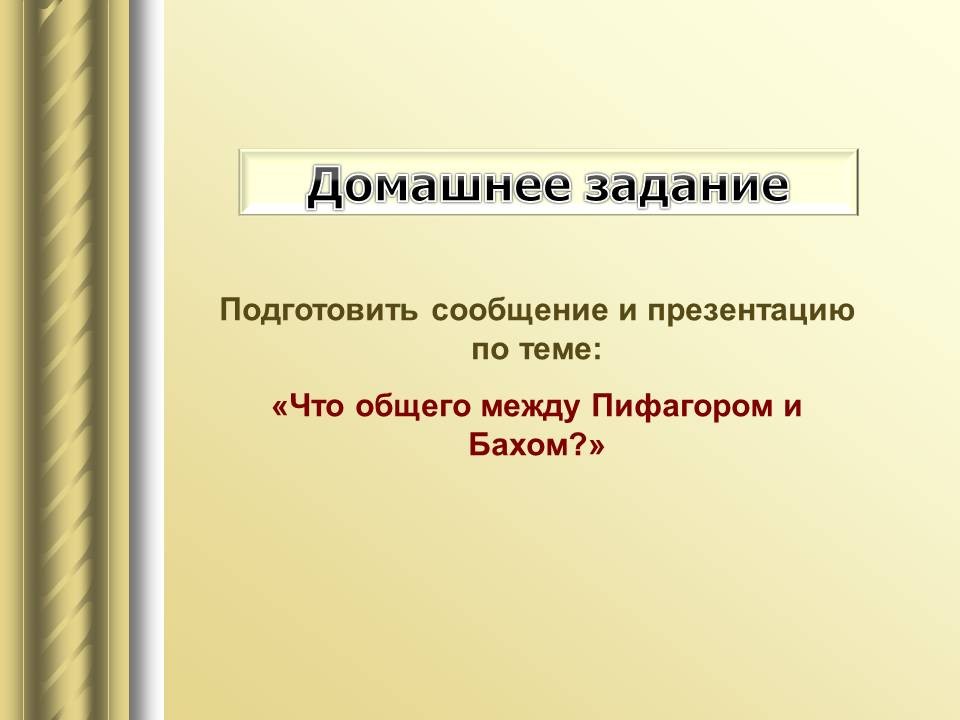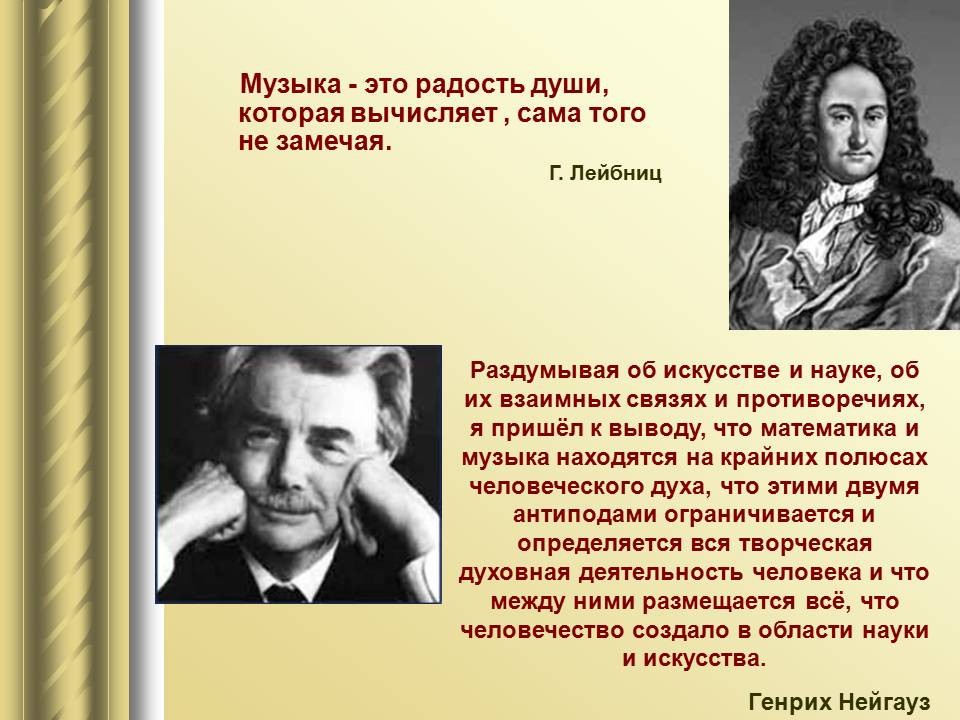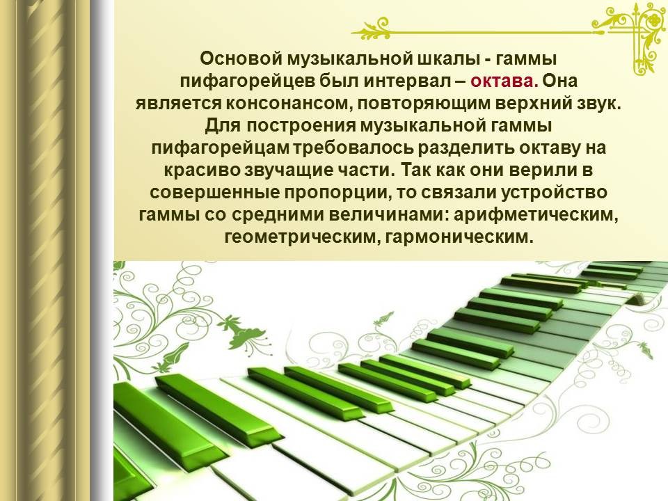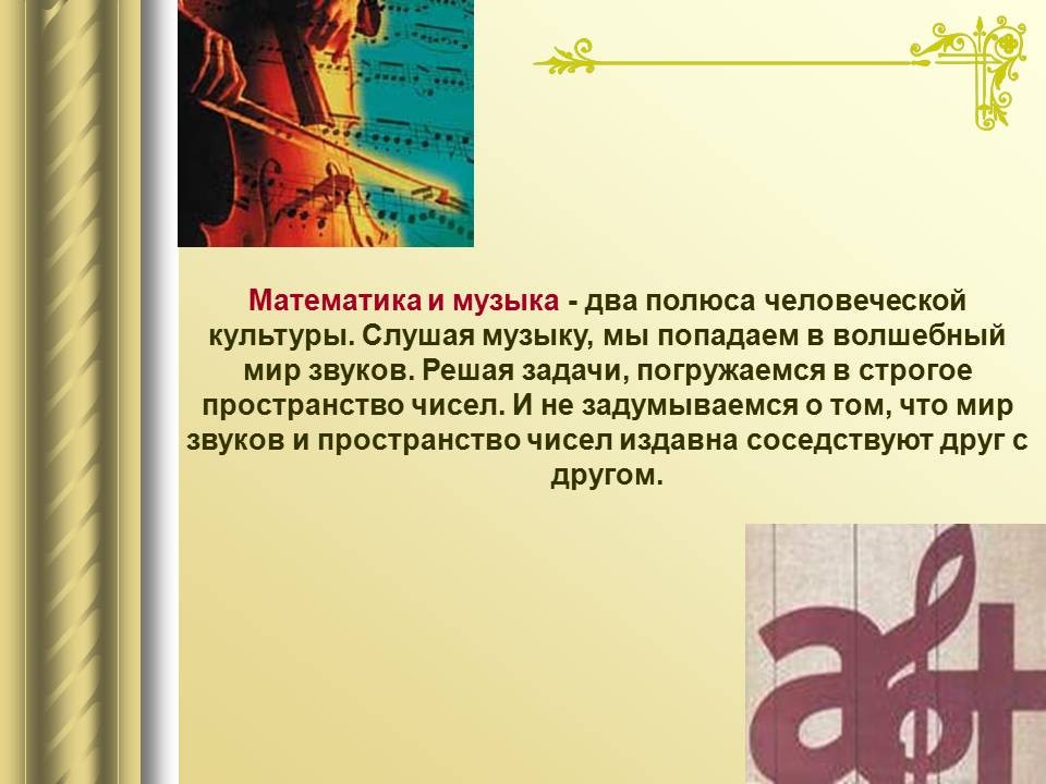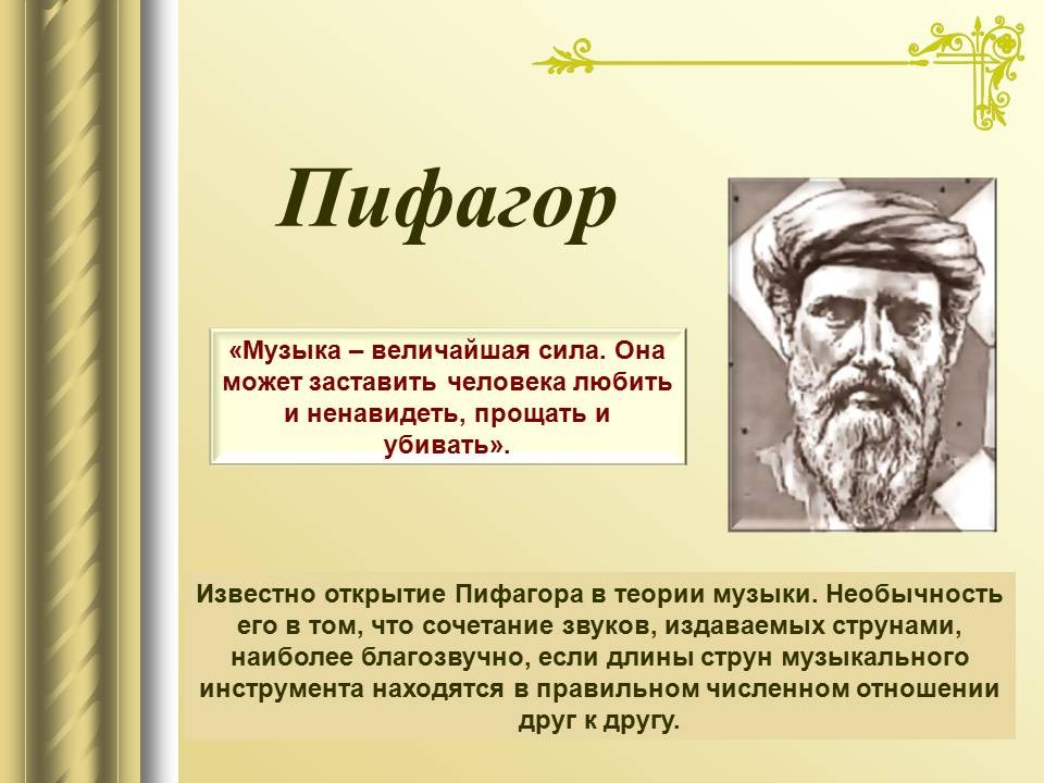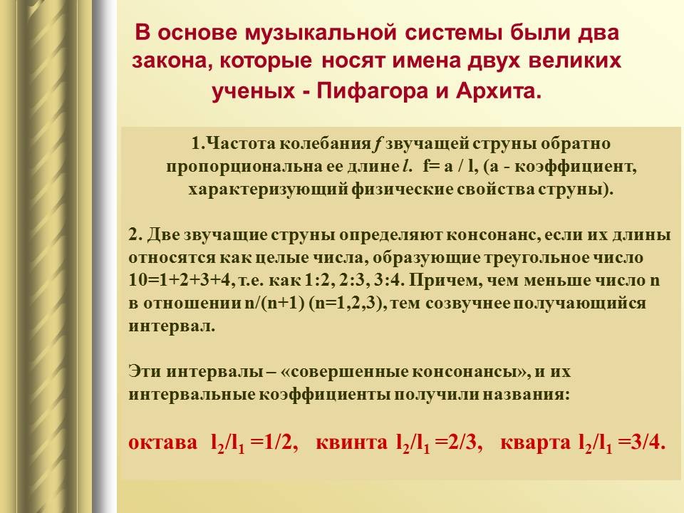 | 9. | Математический строй музыки | 1 | Законы математики в музыке. Музыкальная гармония пропорций. Законы Пифагора и Архита в теории музыки. “Золотое сечение” в музыке. | Воспроизведение законов Пифагора и Архита в теории музыки. |
