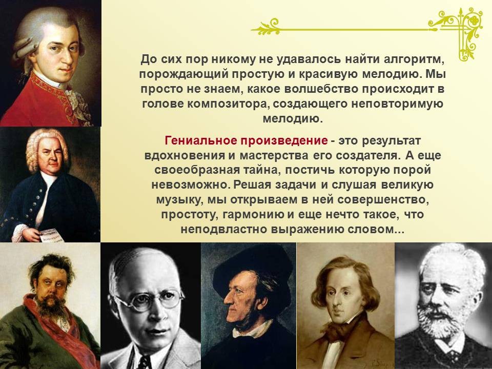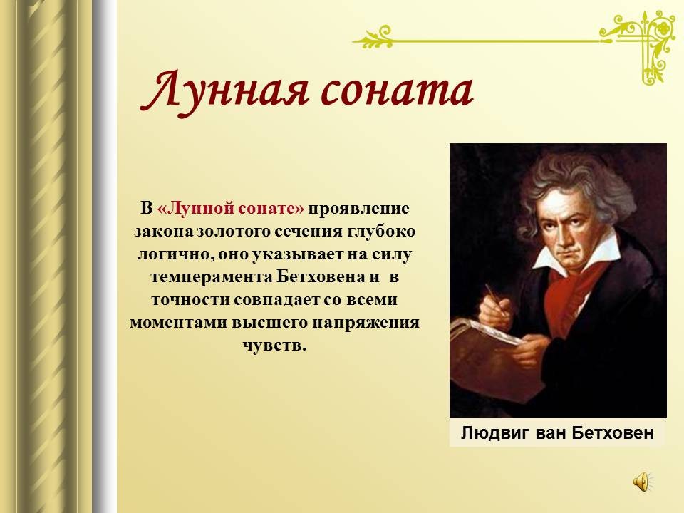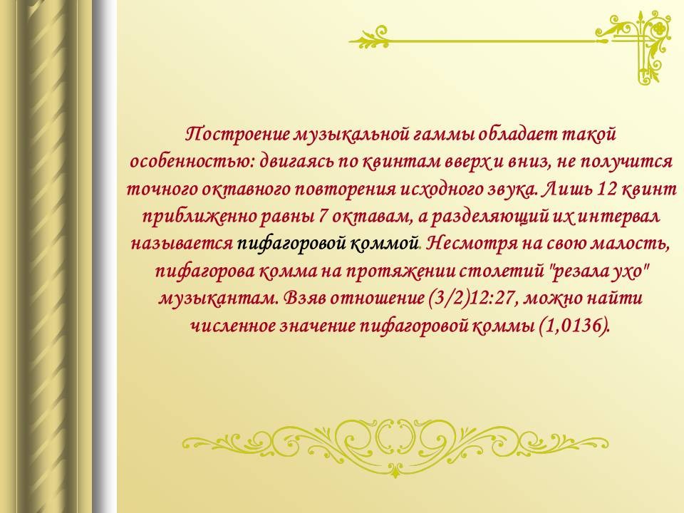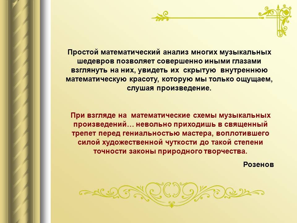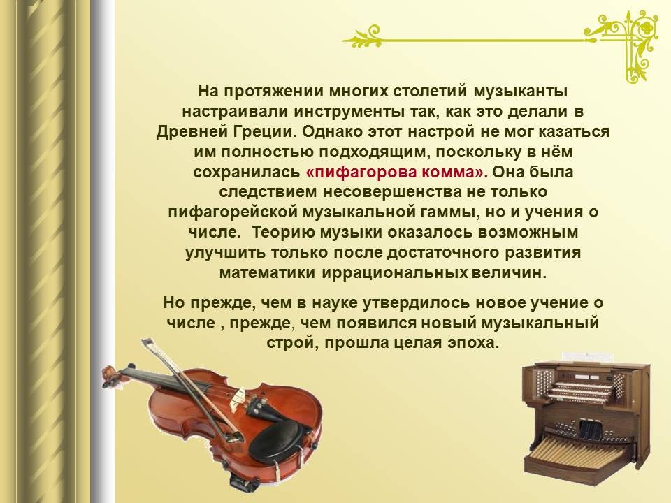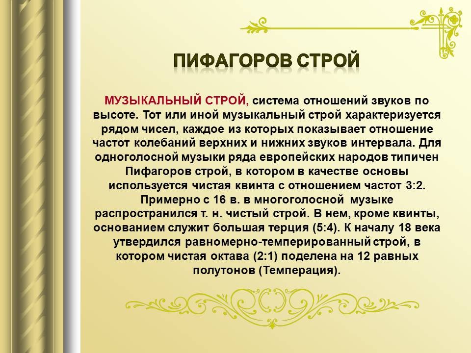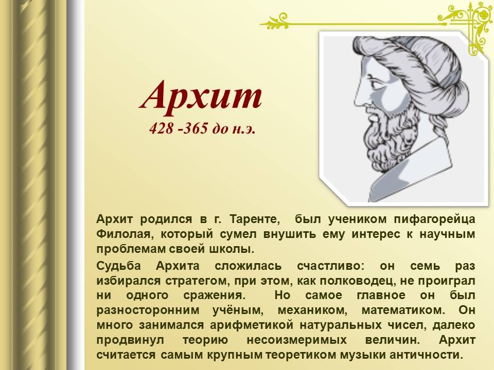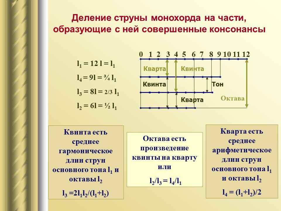 | 9. | Математический строй музыки | 1 | Законы математики в музыке. Музыкальная гармония пропорций. Законы Пифагора и Архита в теории музыки. “Золотое сечение” в музыке. | Воспроизведение законов Пифагора и Архита в теории музыки. |