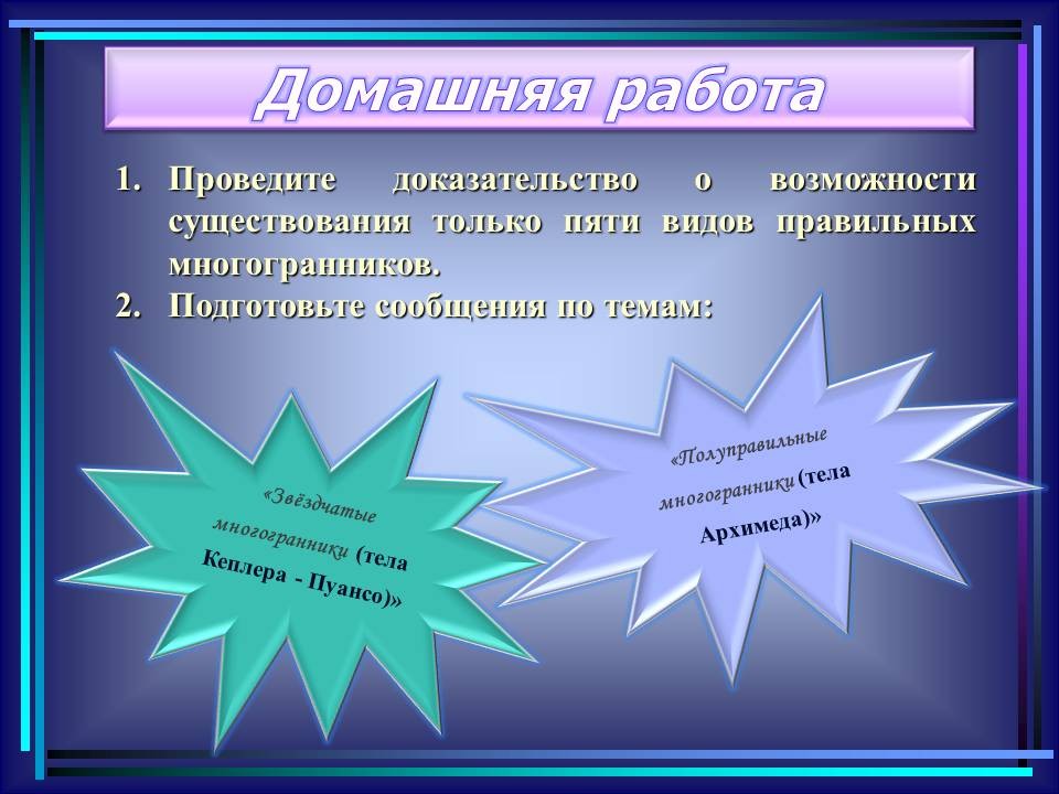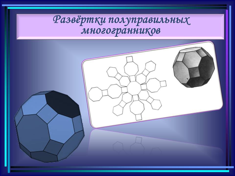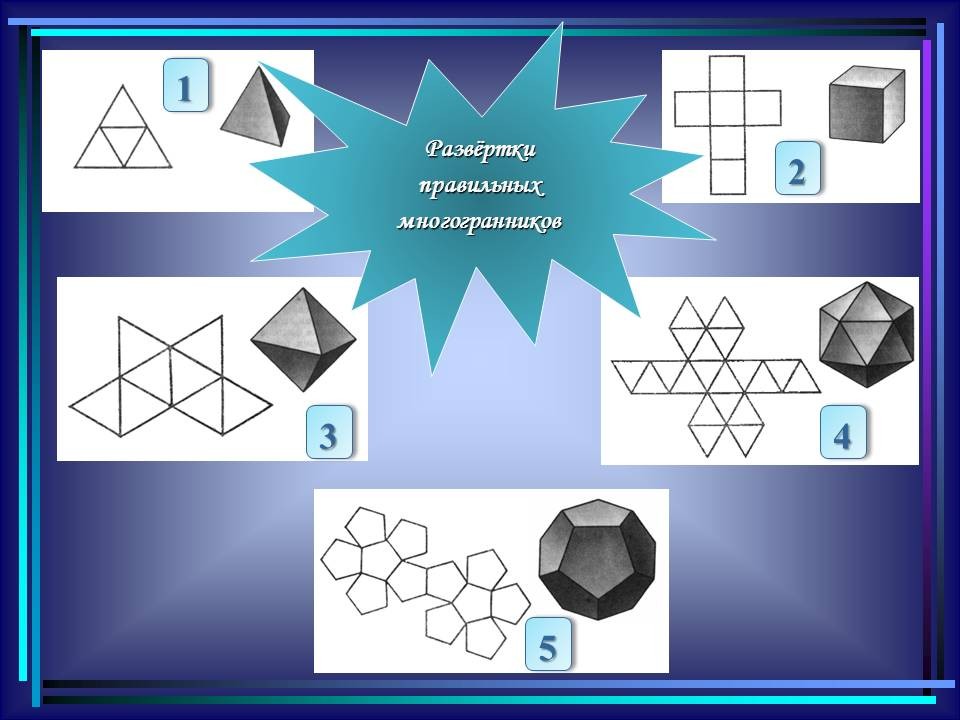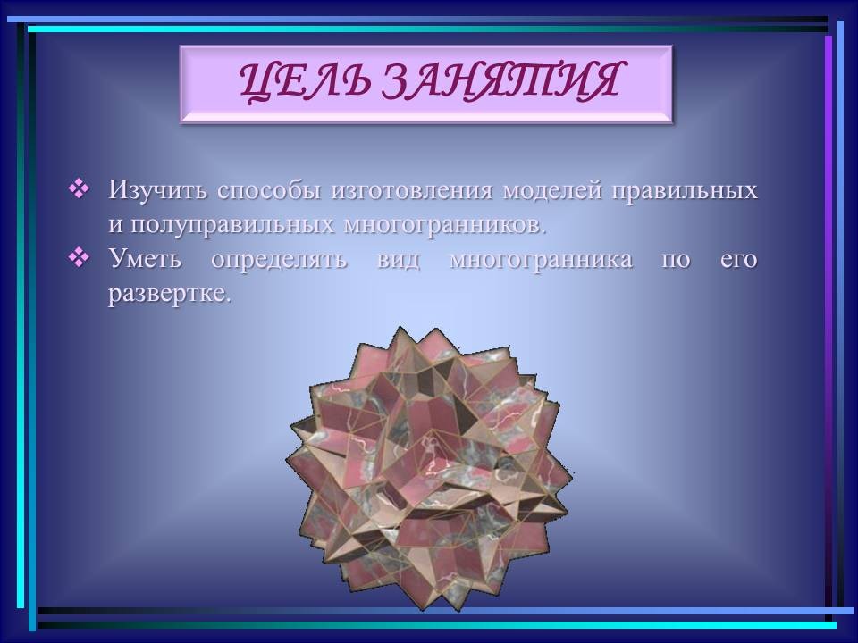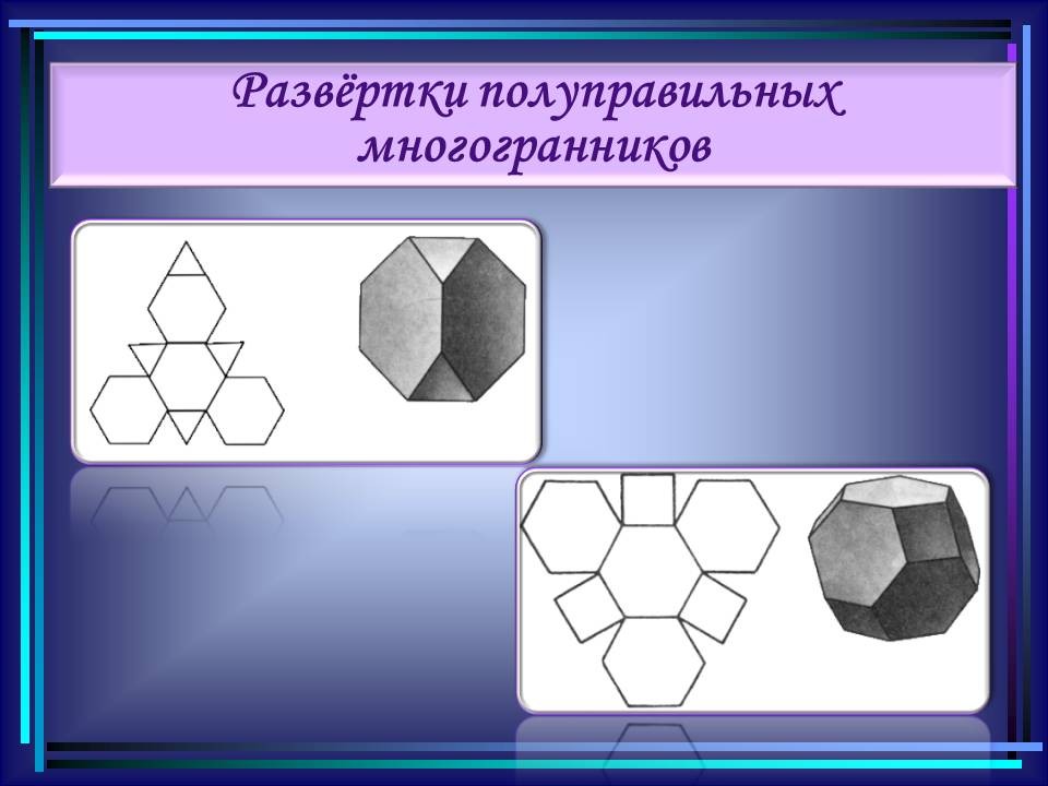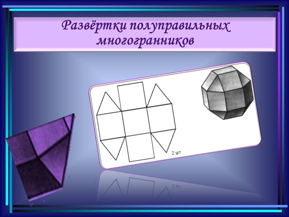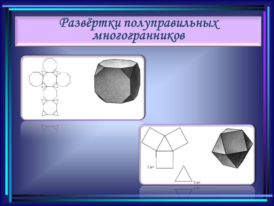 | 10. | Многогранники в гармонии мироздания | 2 | Понятие многогранника. Виды многогранников и их свойства. Платоновы тела. Развёртки многогранников. Моделирование многогранников. | Распознавание на рисунках, чертежах и в окружающем мире правильных, полуправильных и звездчатых многогранников. Определение вида многогранника по его развертке. Изготовление моделей правильных и полуправильных многогранников. |