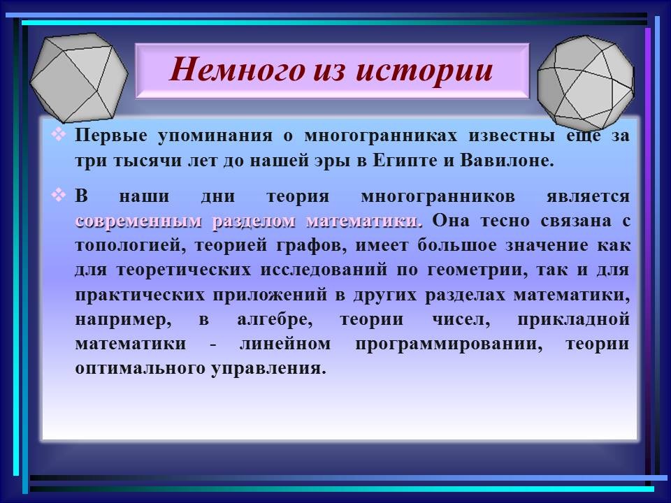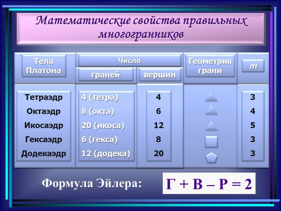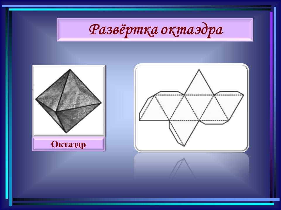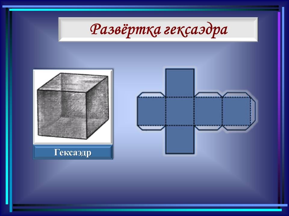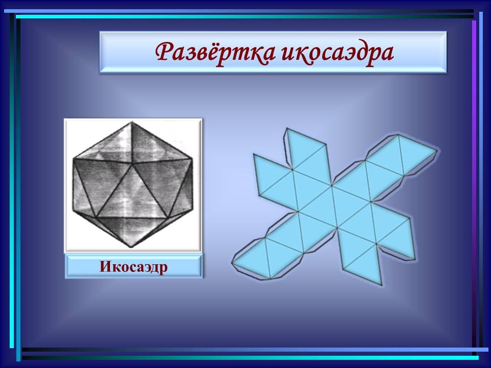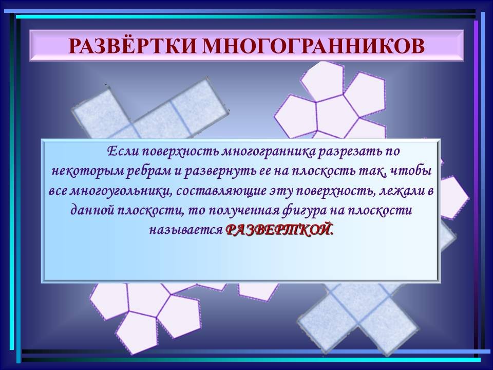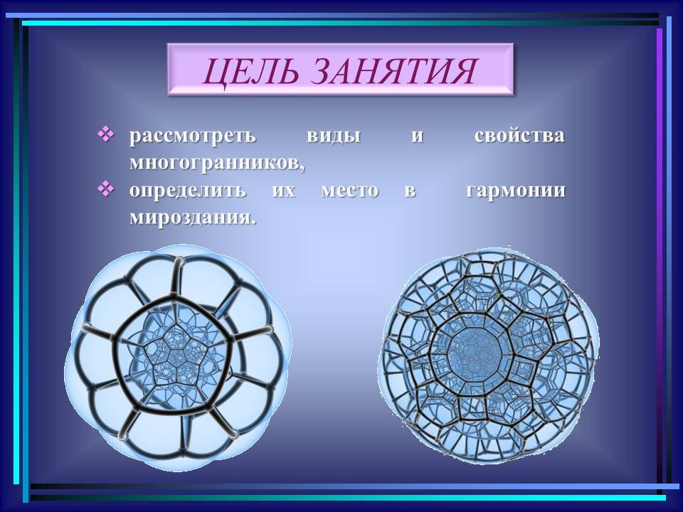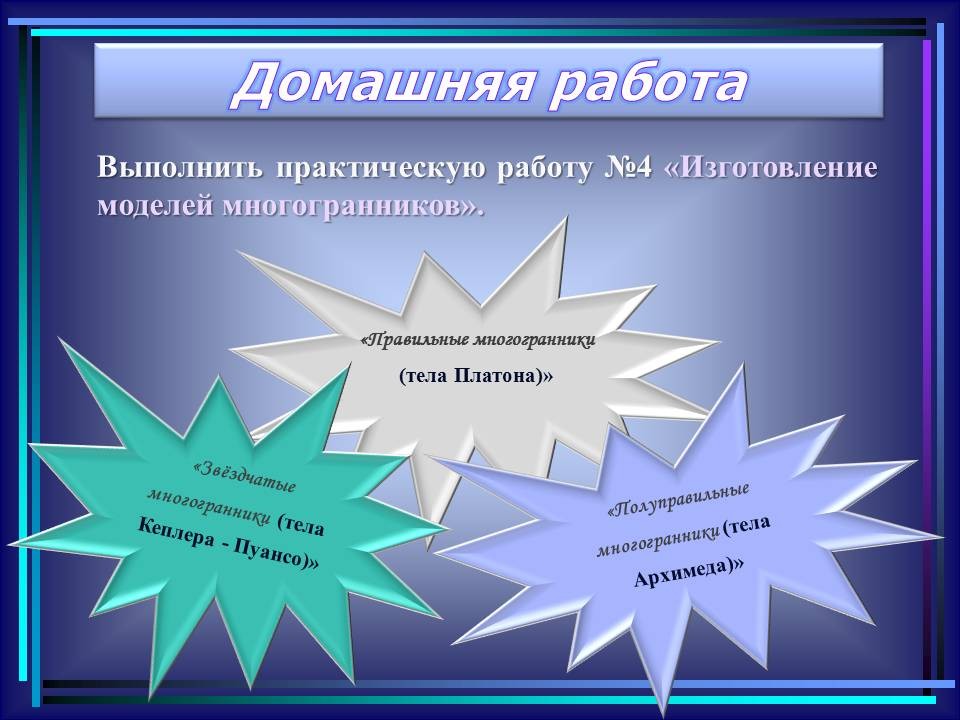 | 10. | Многогранники в гармонии мироздания | 2 | Понятие многогранника. Виды многогранников и их свойства. Платоновы тела. Развёртки многогранников. Моделирование многогранников. | Распознавание на рисунках, чертежах и в окружающем мире правильных, полуправильных и звездчатых многогранников. Определение вида многогранника по его развертке. Изготовление моделей правильных и полуправильных многогранников. |