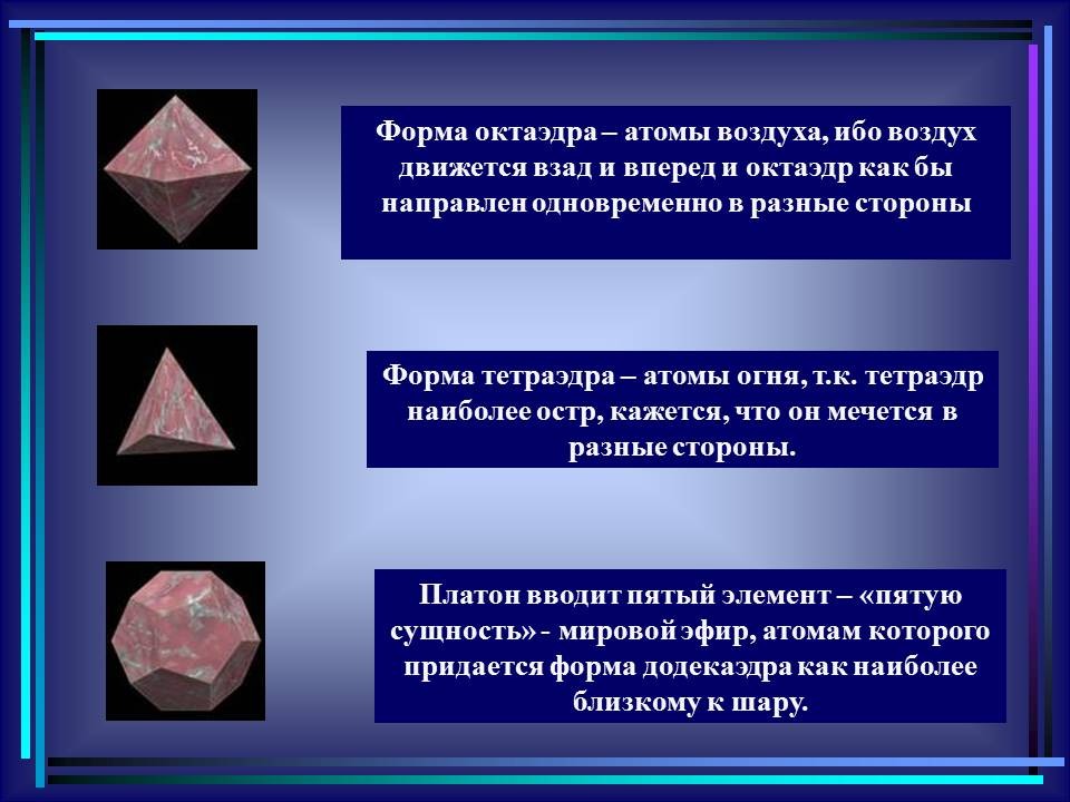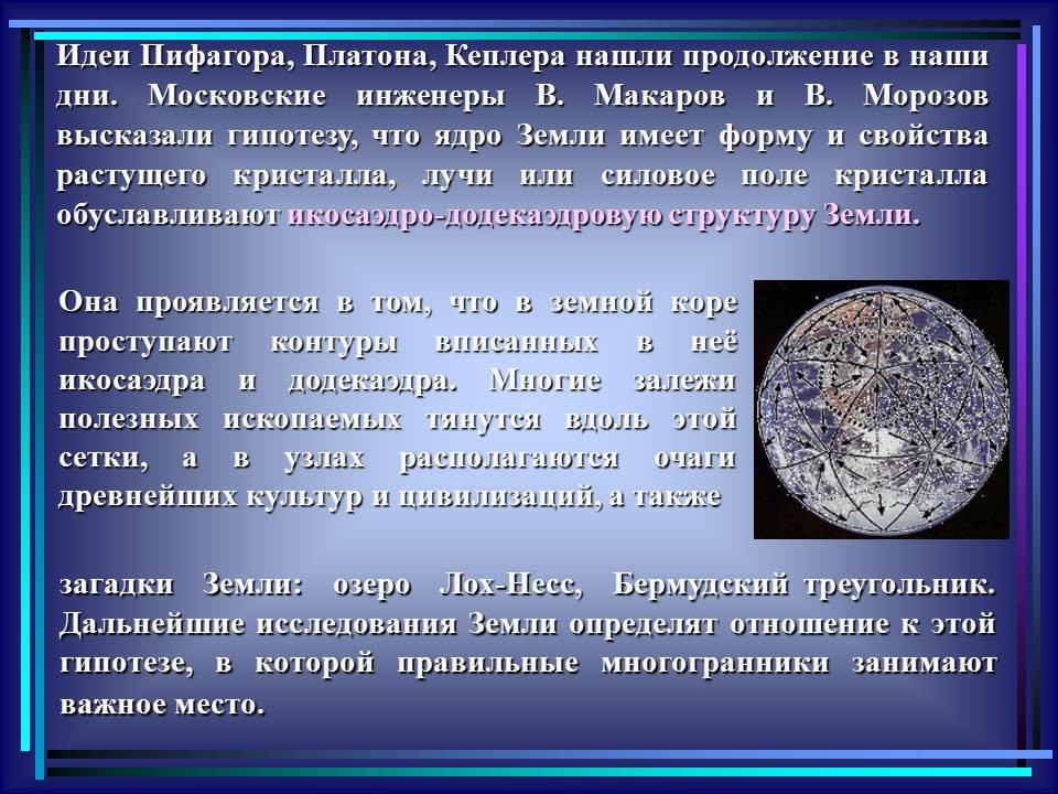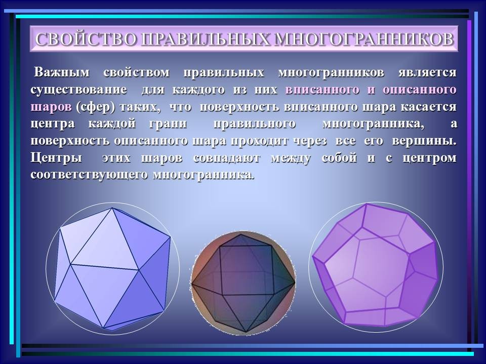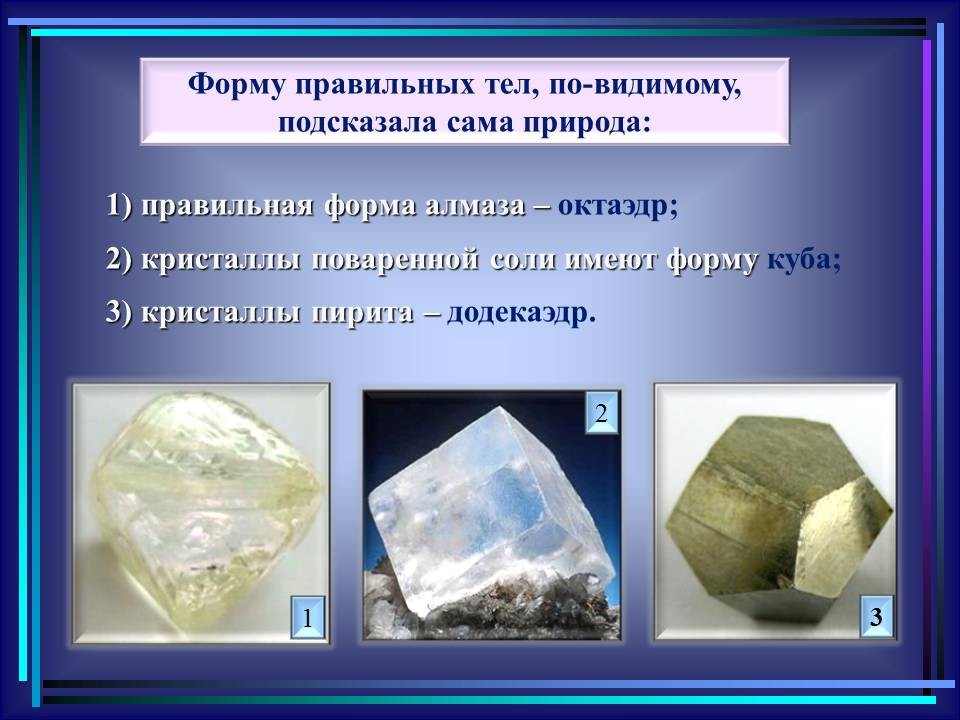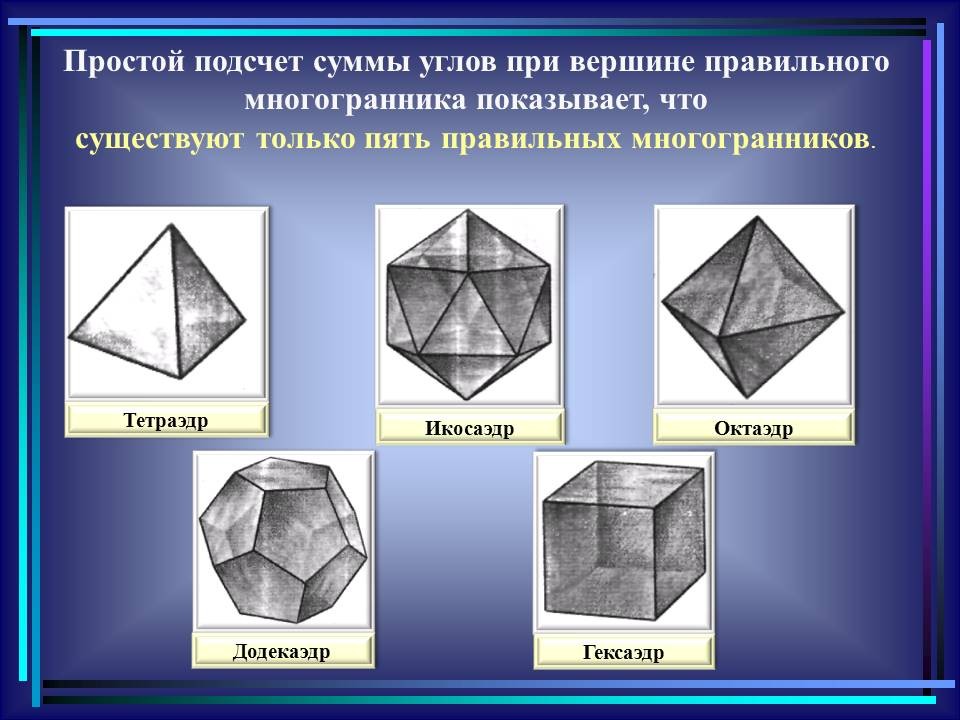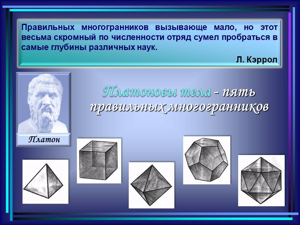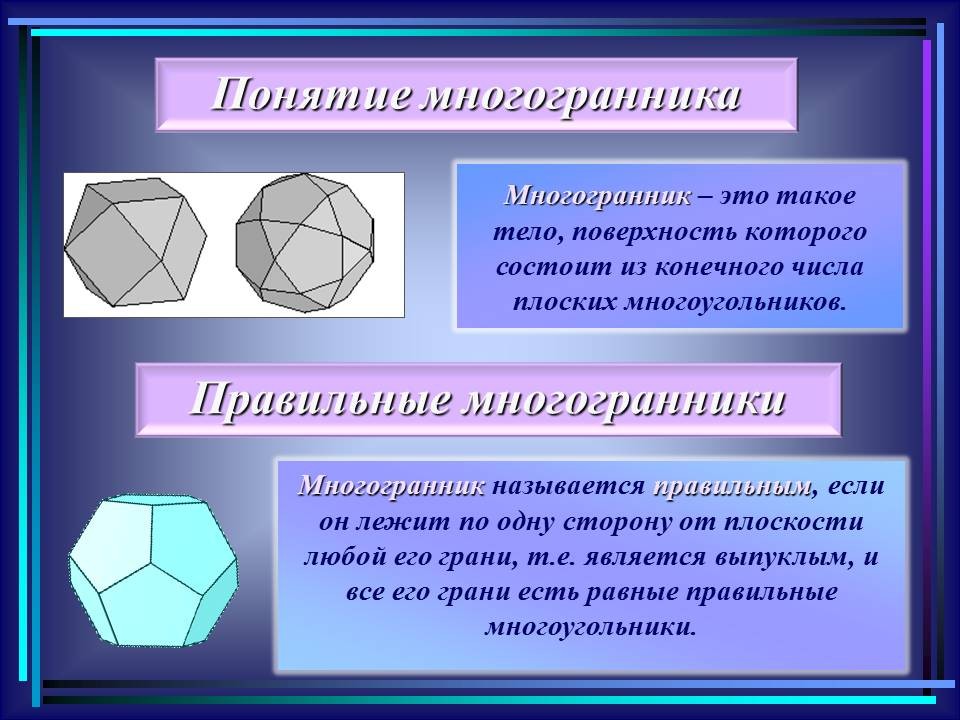 | 10. | Многогранники в гармонии мироздания | 2 | Понятие многогранника. Виды многогранников и их свойства. Платоновы тела. Развёртки многогранников. Моделирование многогранников. | Распознавание на рисунках, чертежах и в окружающем мире правильных, полуправильных и звездчатых многогранников. Определение вида многогранника по его развертке. Изготовление моделей правильных и полуправильных многогранников. |
