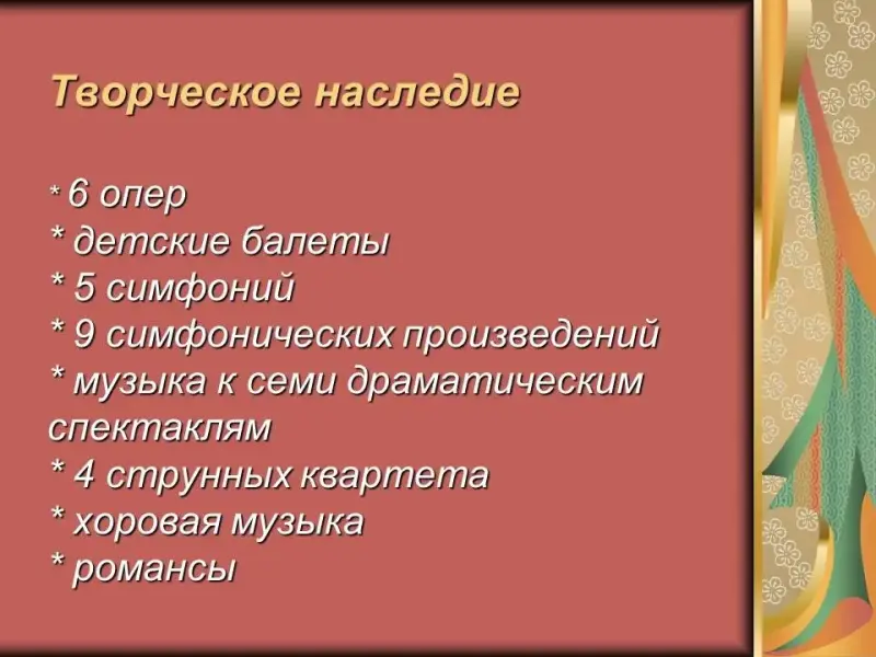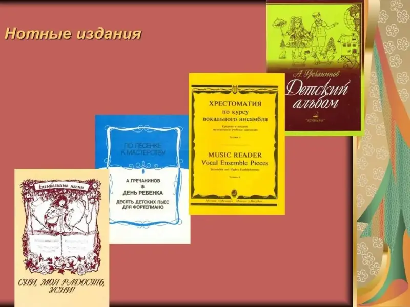 Музыкальное творчество Александра Тихоновича Гречанинова очень многогранно и в него вошли: (Слайд 28)