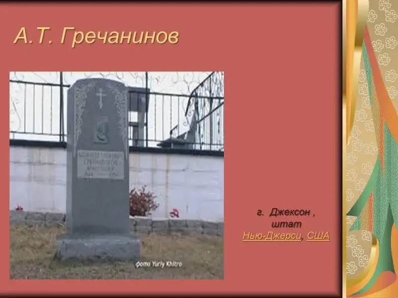 До последних дней Гречанинов мечтал вернуться на Родину, но этому не суждено было осуществиться. Почти оглохший и ослепший, в крайней бедности и одиночестве он скончался на чужбине в 92 года. (Слайд 34) Александр Гречанинов похоронен на Свято- Владимирском православном кладбище в Джексоне (Кассвилл), штат Нью-Джерси, США.