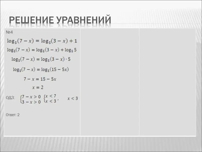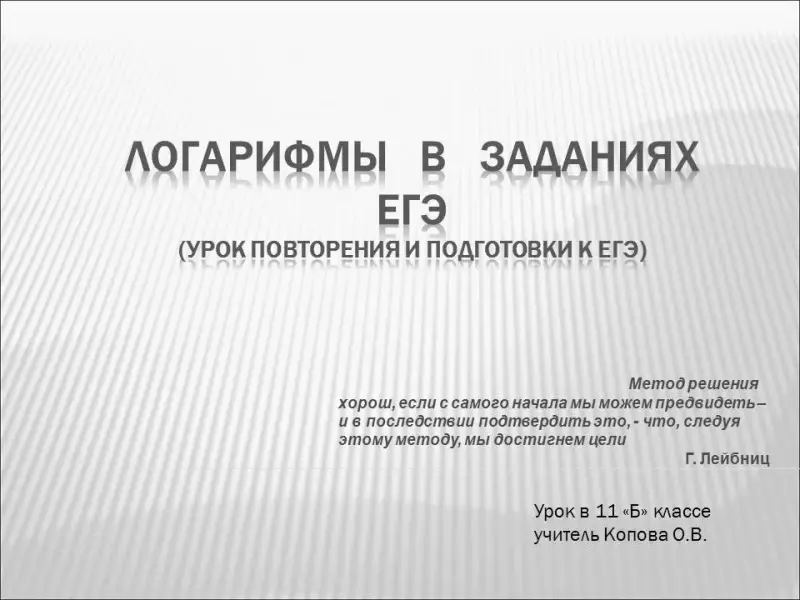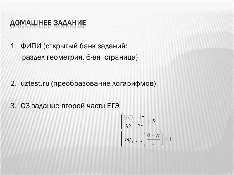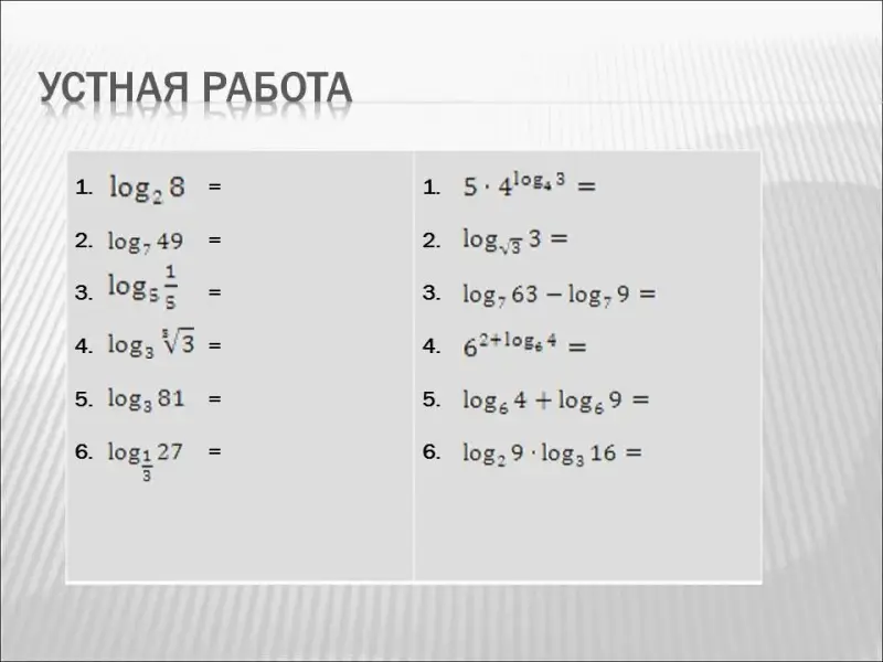 На данном этапе проводится устная работа, в ходе которой учащиеся не только вспоминают свойства логарифмов, но и выполняют простейшие задания ЕГЭ.