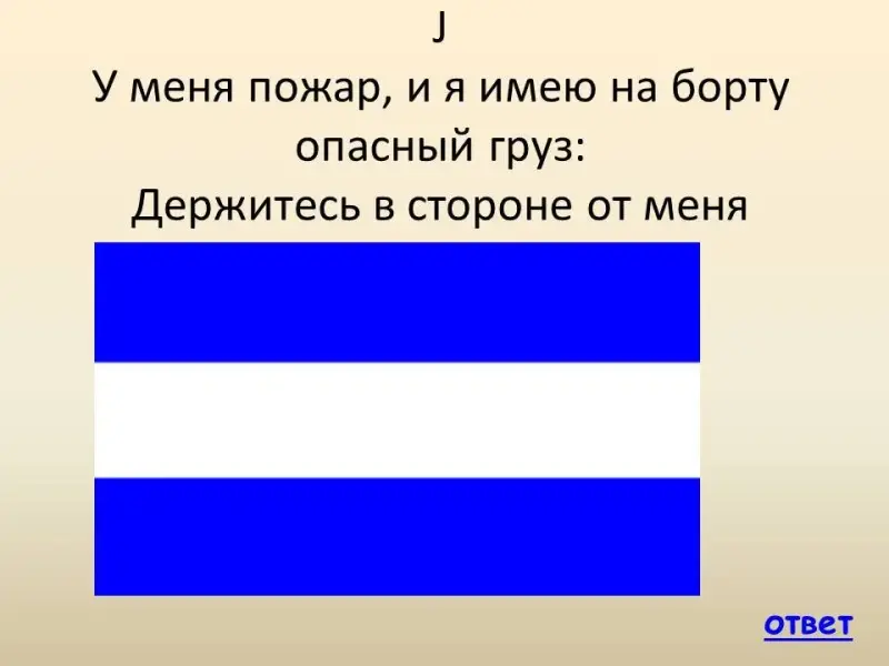 - Назовите флаг и его значение по МСС - J - У меня пожар, и я имею на борту опасный груз. Держитесь в стороне от меня