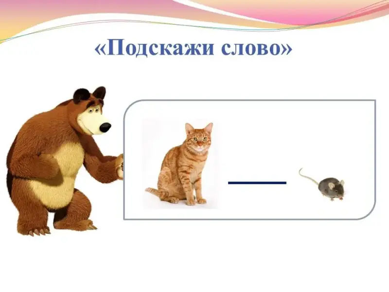 Логопед: - Мишка предлагает поиграть в игру "Подскажи слово". Он приготовил картинки. Вы должны добавить нужное слово, чтобы получилось предложение.
