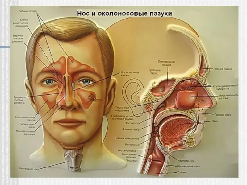 1) Дыхательные пути (носовая полость, носоглотка, глотка, гортань, трахея, бронхи)